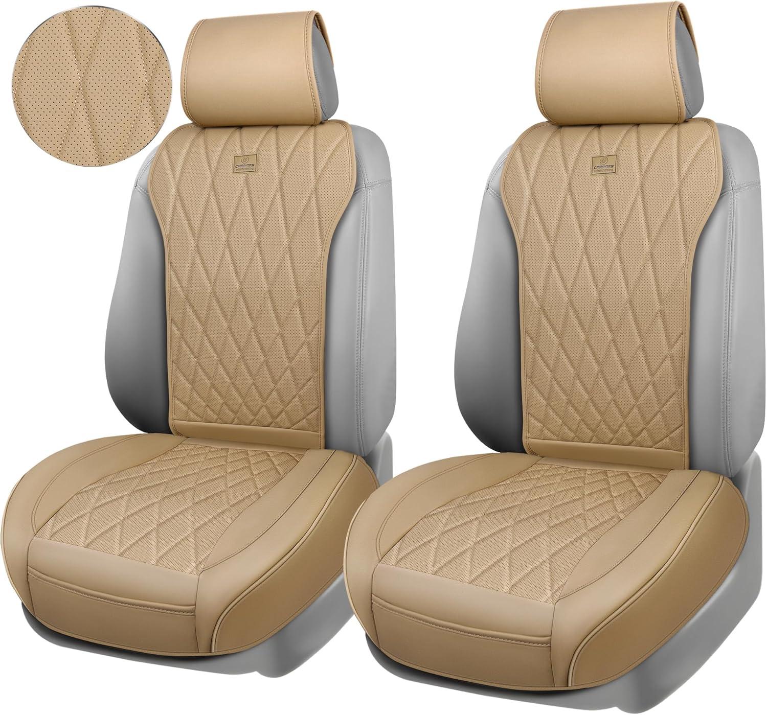 CAR PASS Luxury PU Leather Two Front Car Seat Covers, Waterproof Seat Covers Compatible with Front Seat Armrests, Airbag Compatible Anti- Slip Universal Fit for Cars Suvs Vans Trucks Black Blue(Solid-Beige)